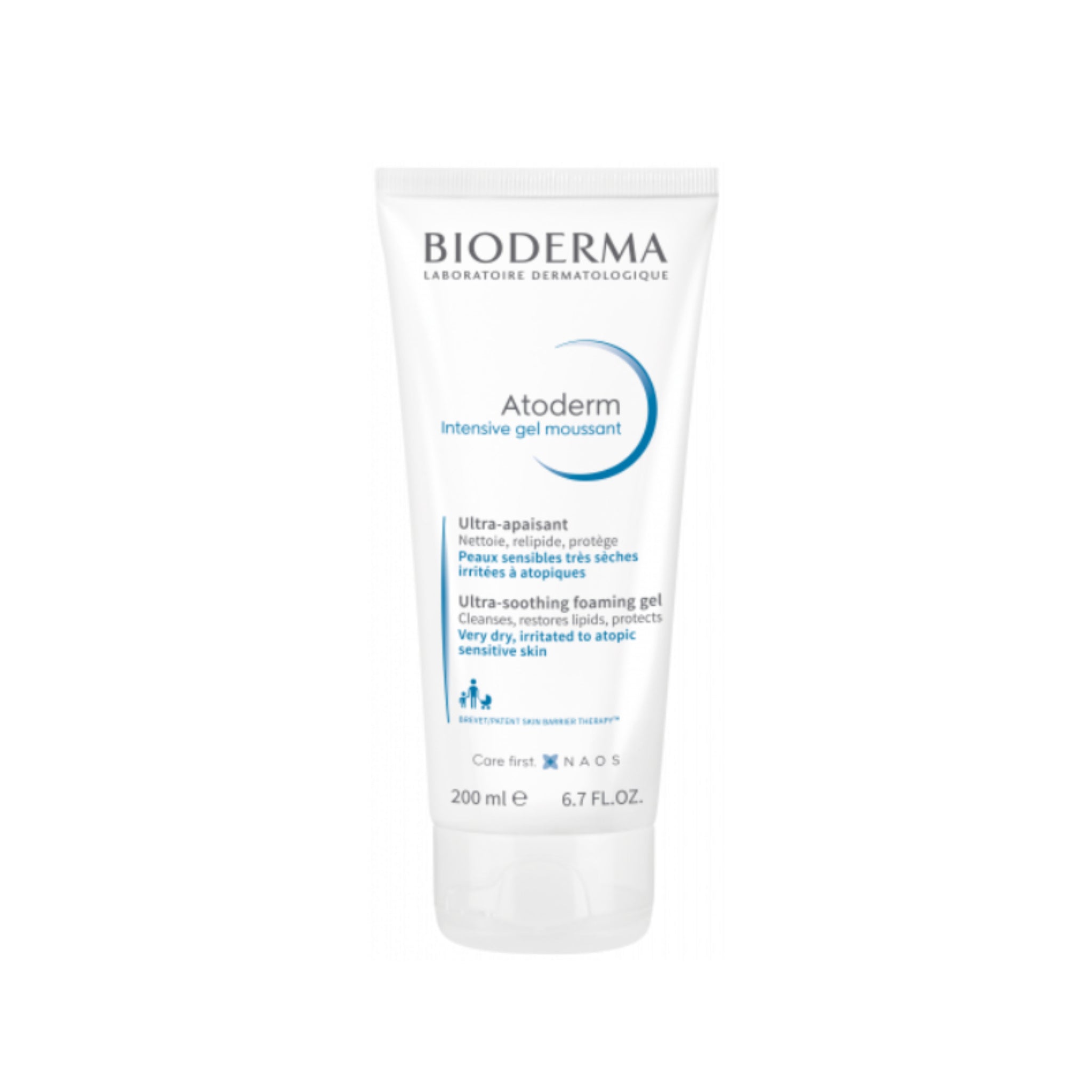 Bioderma Atoderm Intensive Gel Moussant é um cuidado de limpeza suave, anti-prurido para a pele muito seca irritada e atópica do bebé, criança e adulto.