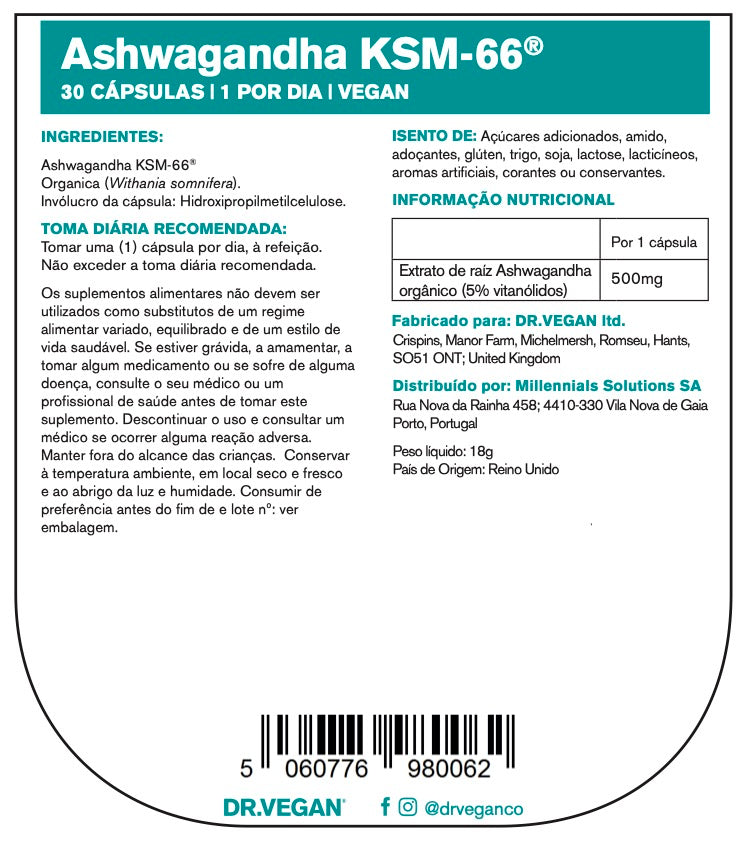Ingredientes [Por Cápsula]: Ashwagandha KSM-66® Organica (Withania somnifera) 500mg;