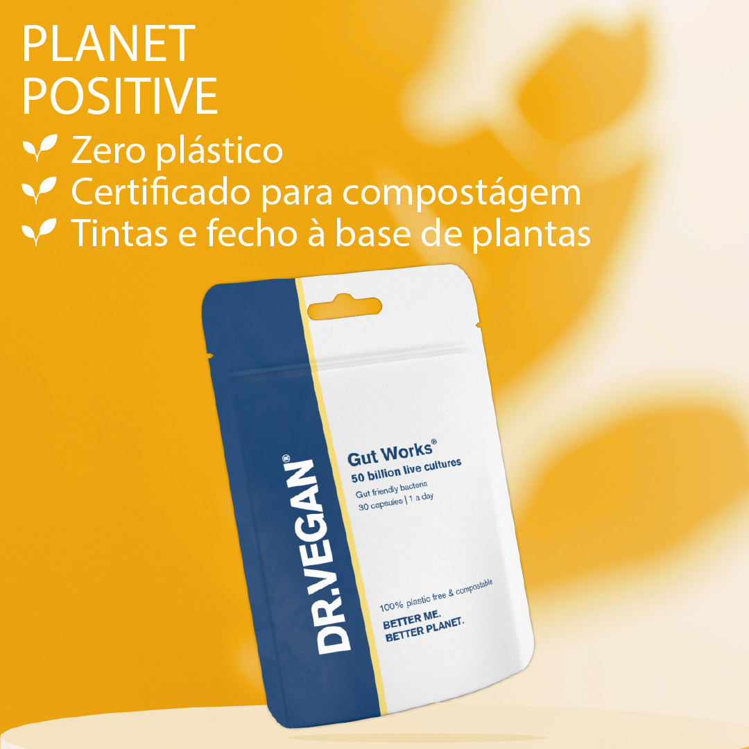 100% SEM PLÁSTICO: As embalagens DR.VEGAN não contêm plástico. Embalagens fabricadas com selos à base de amido, tintas à base de plantas e papel para uma alternativa sustentável.