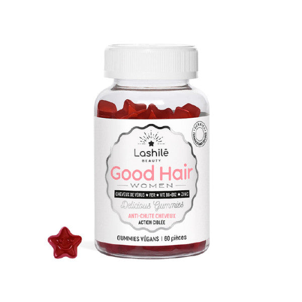 Good Hair Women é um suplemento alimentar em gomas, com aromas naturais e 100% vegan, que ajuda a prevenir a queda de cabelo.Formulado com com Avenca, que ajuda a prevenir a perda de cabelo, Zinco e Vitamina B8 que contribuem para a manutenção de cabelo normal e Mirtilo que apoia a microcirculação do couro cabeludo. Sem gelatina e sem glúten. Não recomendado a crianças com menos de 18 anos, mulheres grávidas ou a amamentar. Não recomendado a pessoas que sofram de doenças que levem a uma acumulação anormal de ferro (hemocromatose, policitémia).Sabor a Frutos Vermelhos.