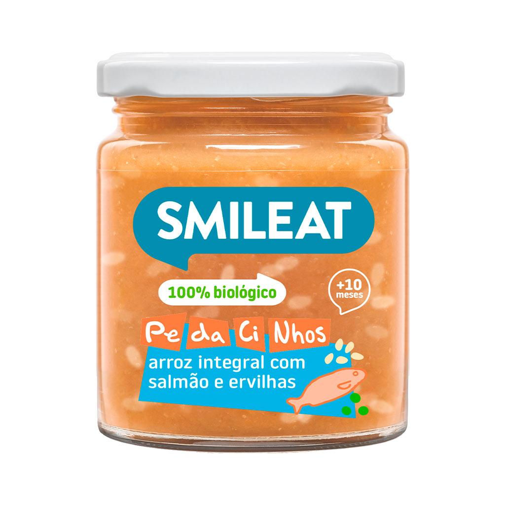 O Smileat Frasco de PE-DA-CI-NHOS Arroz Integral com Salmão e Ervilhas é uma refeição deliciosa e equilibrada, especialmente desenvolvida para bebés a partir dos 10 meses. Com pequenos pedaços para ajudar na aprendizagem da mastigação e no desenvolvimento psicomotor, é perfeito para introduzir novas texturas na alimentação do bebé.